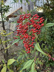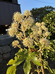 ヤツデの花が咲いています。南天も沢山の実をつけています。