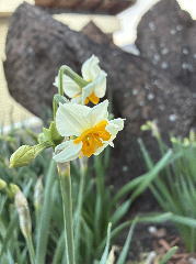 今冬は寒さが厳しく、門前のスイセンも境内の蝋梅(ロウバイ)もやっと咲き出しました。